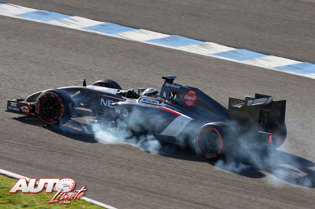 Apurada de frenada de Esteban Gutiérrez con el Sauber C33 durante las pruebas de pretemporada de Fórmula 1 2014, celebradas en el circuito de Jerez.