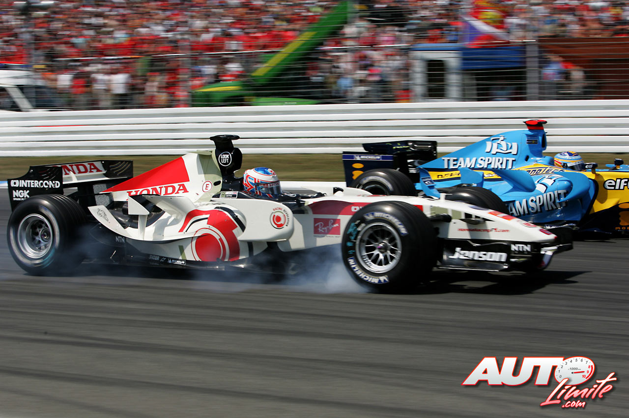 Jenson Button (Honda RA106) en pleno adelantamiento a Fernando Alonso (Renault R26) durante el Gran Premio de Alemania de Fórmula 1 de 2006, disputado en el circuito de Hockenheim.