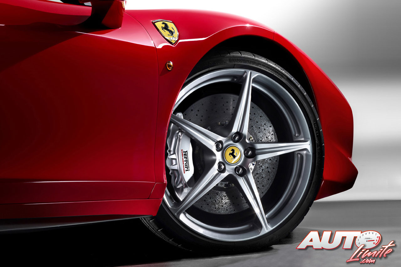 El Ferrari 458 Spider lleva de serie cuatro discos ventilados flotantes, propios de un coche de carreras. Están realizados en material carbono cerámico y cuentan con 398 mm de diámetro delante y 360 mm detrás. Las pinzas monobloque de aluminio son fijas y están realizadas por los especialistas de Brembo, al igual que los discos de freno. Las delanteras son de mayor tamaño y tienen seis pistones, mientras que las traseras tienen cuatro pistones.