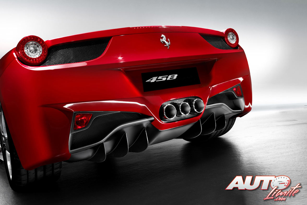 El difusor trasero, junto con el fondo plano, cumple una importante función aerodinámica en el Ferrari 458 Spider, aportando un mayor aplastamiento del coche contra el suelo que incrementa el agarre de los neumáticos.