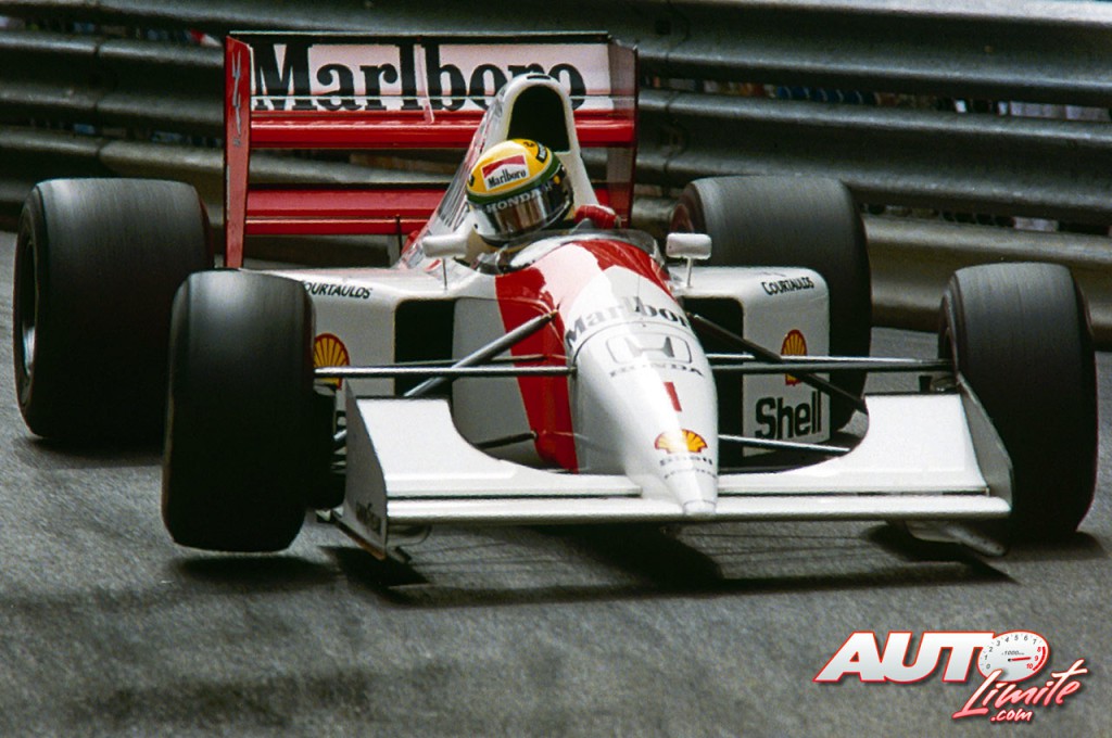 Ayrton Senna en pleno apoyo con su McLaren-Honda MP4/7A 3.5 V12, durante el GP de Mónaco de 1992, disputado en el circuito urbano de Monte Carlo.