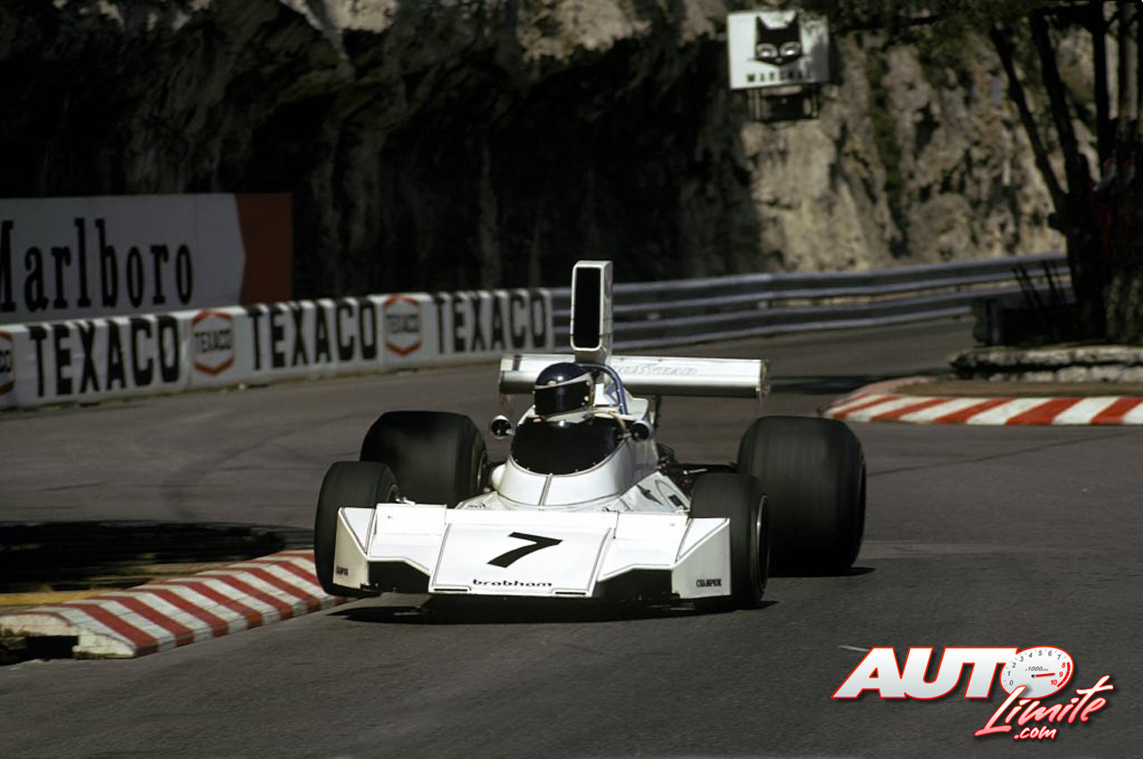 Carlos Reutemann apurando la chicane del circuito urbano de Monte Carlo al volante del Brabham-Ford BT44 3.0 V8, durante el GP de Mónaco de 1974.