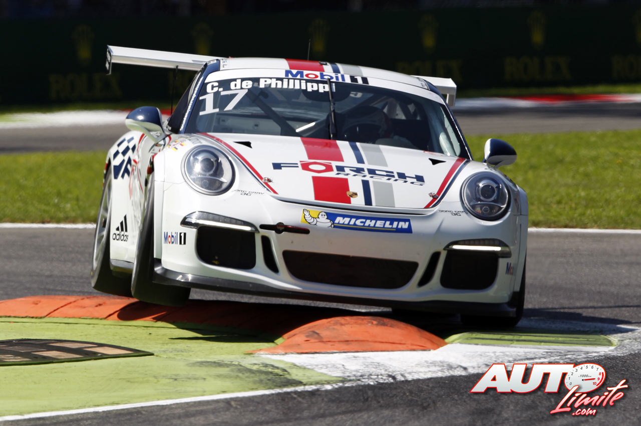 Connor de Phillippi al volante de su Porsche 911 GT3 Cup durante la prueba de la Porsche Supercup 2014 disputada en el circuito de Monza (Italia).