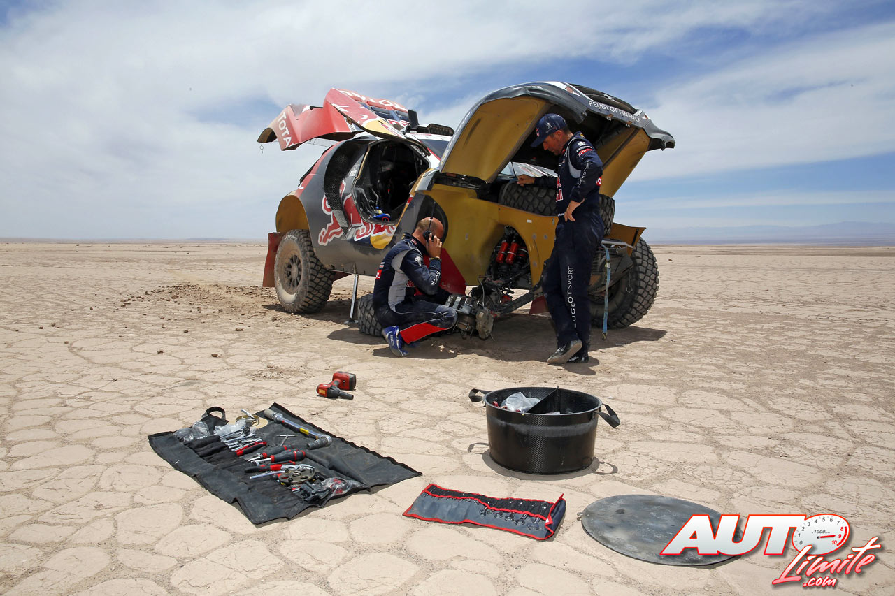 Stephane Peterhansel con problemas mecánicos en el Peugeot 2008 DKR durante la 9ª etapa del Rally Dakar 2015, disputada entre las localidades chilenas de Iquique y Calama.