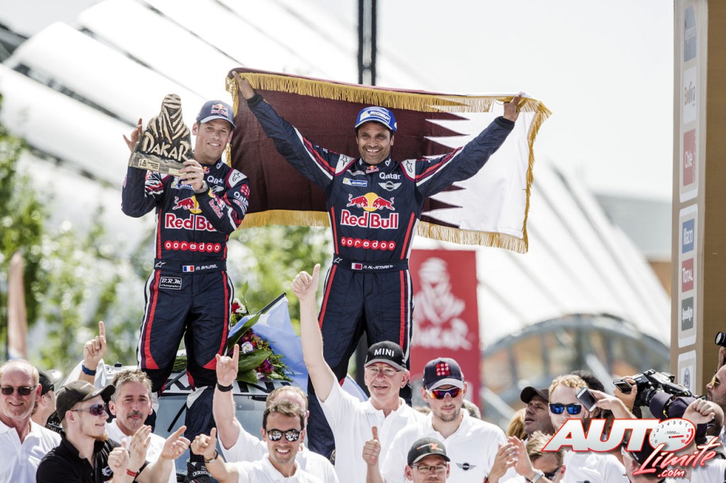 Nasser Al-Attiyah y su copiloto, Matthieu Baumel, celebran sobre el podio de Technopolis su victoria en el Rally Dakar 2015.