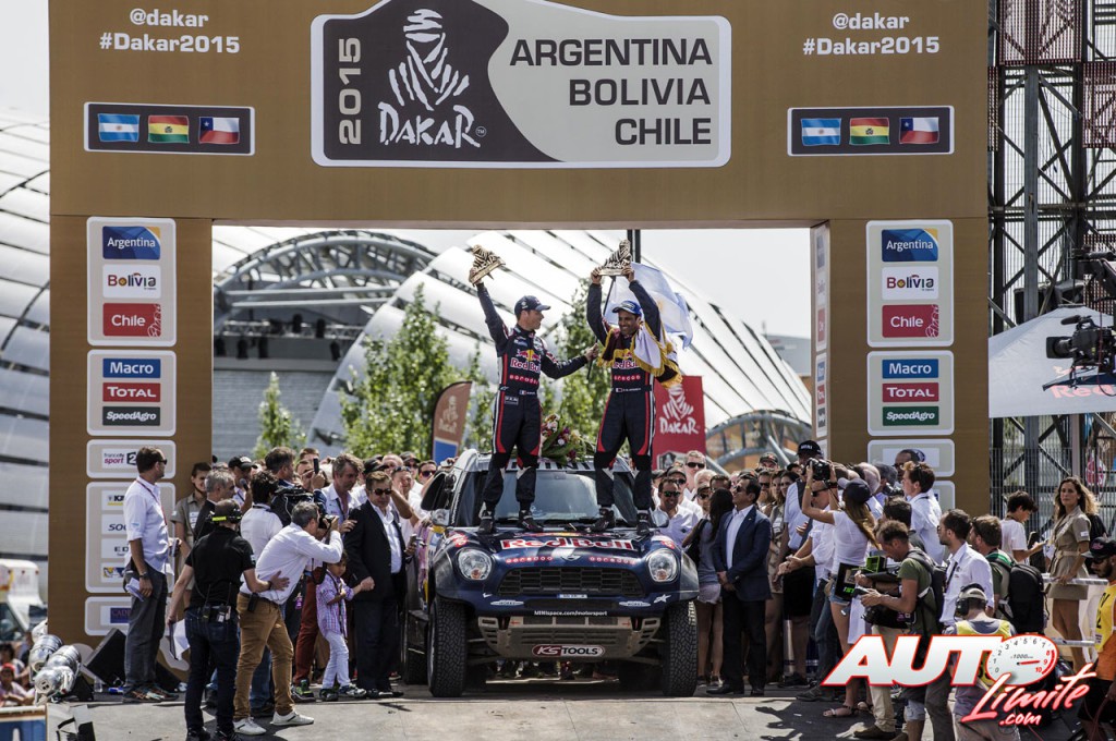 Nasser Al-Attiyah y su copiloto, Matthieu Baumel, celebran sobre el podio de Technopolis su victoria en el Rally Dakar 2015.