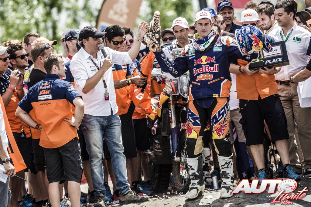 Marc Coma celebra sobre el podio de Technopolis su victoria en el Rally Dakar 2015.