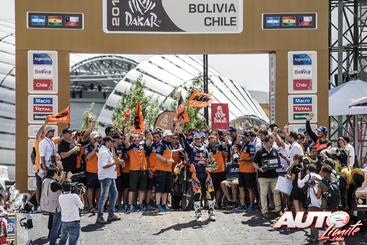 Marc Coma celebra sobre el podio de Technopolis su victoria en el Rally Dakar 2015.