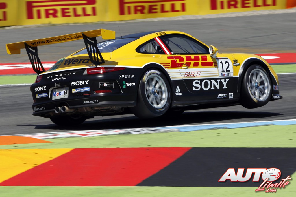 Philipp Eng al volante del Porsche 911 GT3 Cup, durante la carrera disputada en el circuito de Hockenheim (Alemania), en una prueba puntuable para la Porsche Supercup 2014.