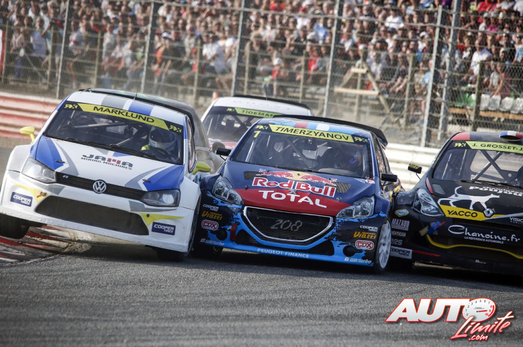 Timur Timerzyanov (Peugeot 208 RX) queda aprisionado en medio de otros rivales durante la carrera disputada en el circuito de Loheac (Francia), puntuable para el Campeonato del Mundo de Rallycross 2014.