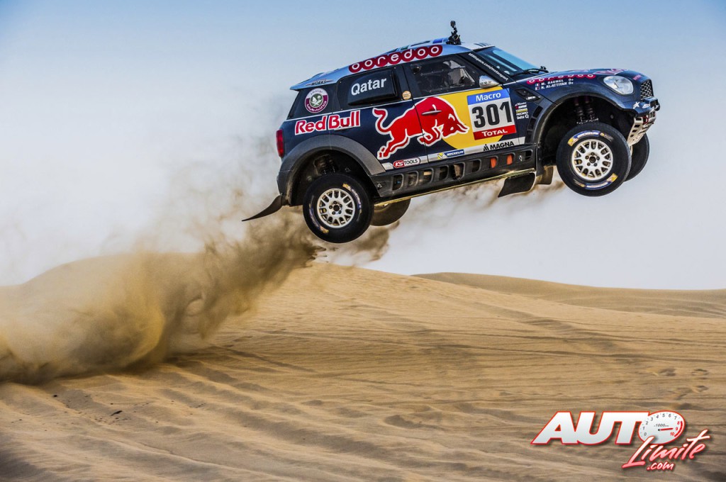 Nasser Al-Attiyah "volando" con el Mini ALL4 Racing en el desierto de la prueba UAE Dubai, puntuable para la Copa del Mundo de Rallyes Todo Terreno 2015.