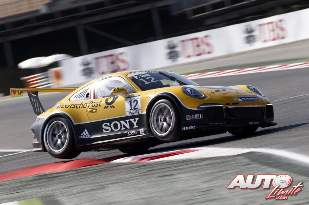 Philipp Eng al volante del Porsche 911 GT3 Cup, durante la prueba de la Porsche Supercup 2014 disputada en el circuito de Montmeló (España).