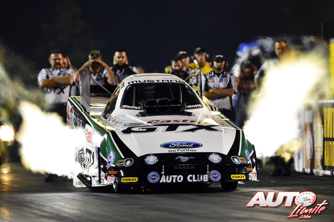 John Force al volante de su Ford Mustang de la categoría "Funny Cars", en una prueba del Campeonato Americano de dragsters "NHRA" 2013 ("National Hot Rod Association"), disputada en la pista "Route 66 Raceway" de Joliet (Illinois - EEUU).