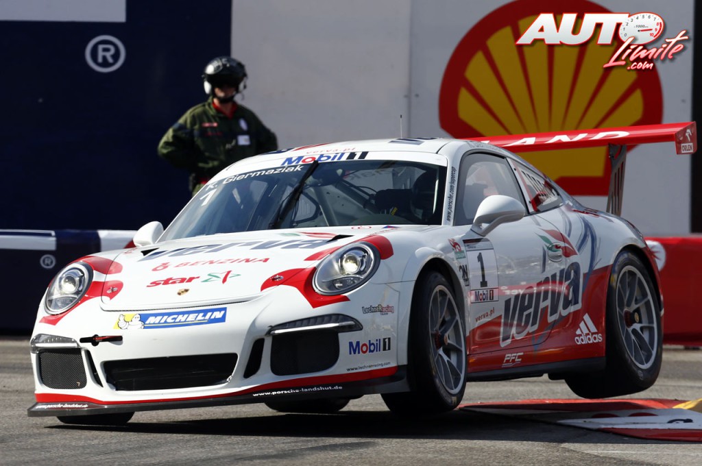 Kuba Giermaziak al volante del Porsche 911 GT3 Cup, durante la prueba disputada en el circuito urbano de Mónaco, puntuable para la Porsche Supercup 2015.