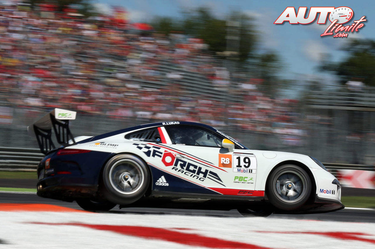 Robert Lukas, al volante del Porsche 911 GT3 Cup, durante la prueba disputada en el circuito de Monza (Italia), puntuable para la Porsche Supercup 2015.