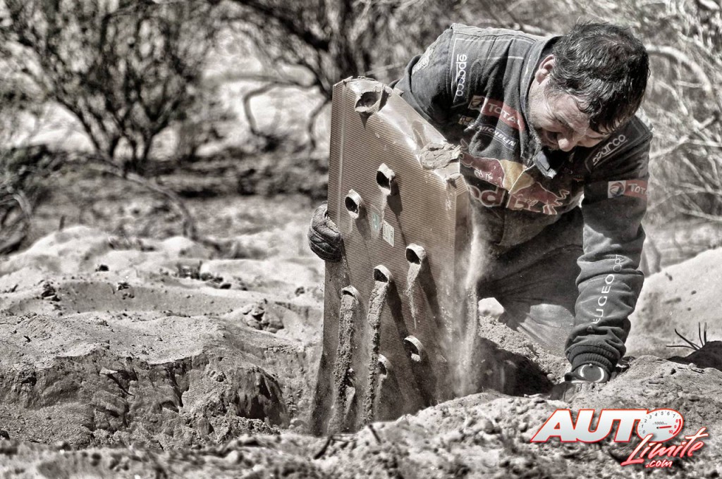 Daniel Elena, copiloto de Sébastien Loeb, extasiado por el esfuerzo. Su Peugeot 2008 DKR16 quedó atrapado en la tierra en la etapa 9 del Rally Dakar 2016, disputada en un bucle realizado entre Belén y Belén.