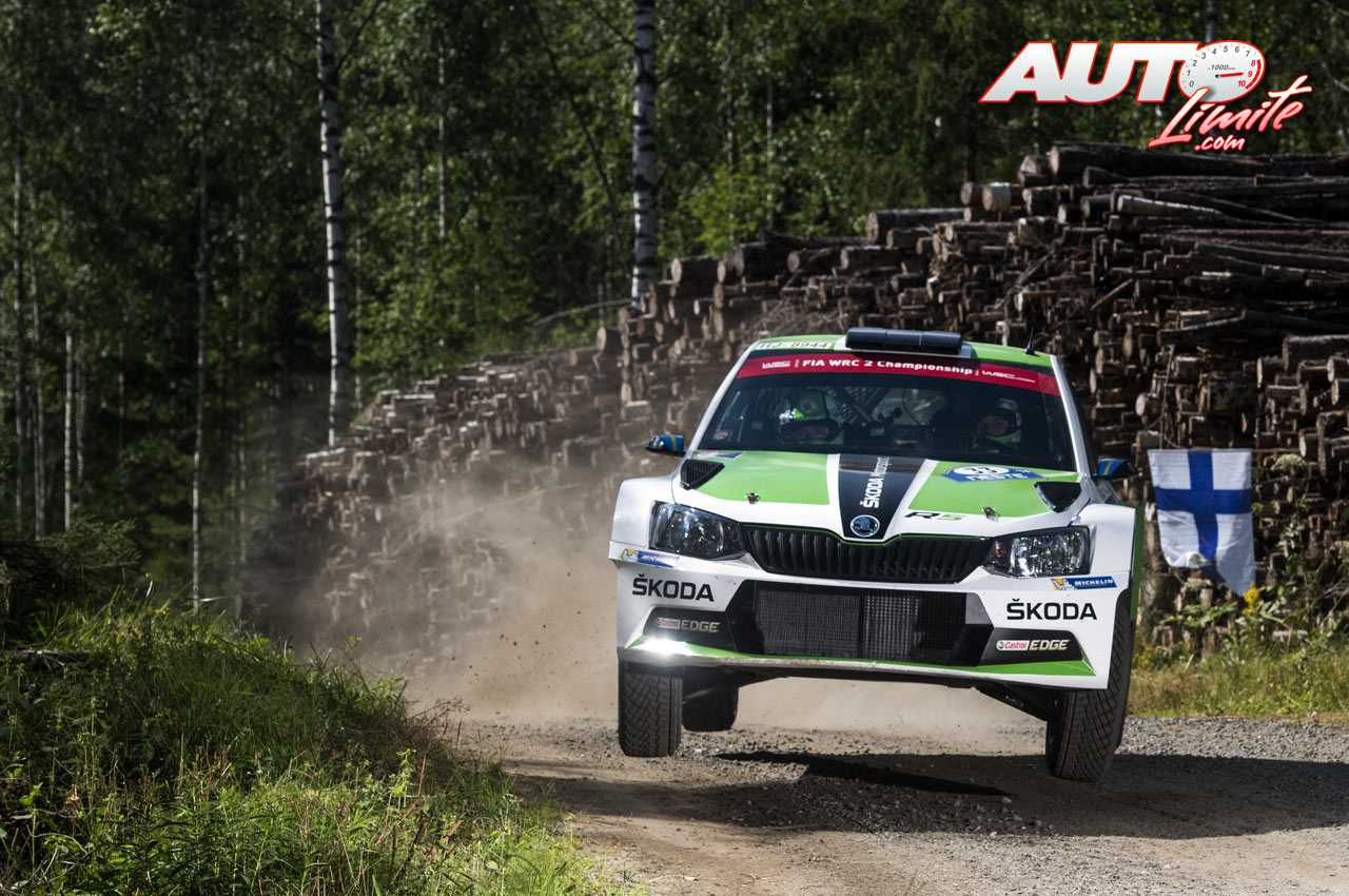 Pontus Tidemand al volante del Skoda Fabia R5 WRC2, durante el Rally de Finlandia 2016, puntuable para el Campeonato del Mundo de Rallyes WRC2.