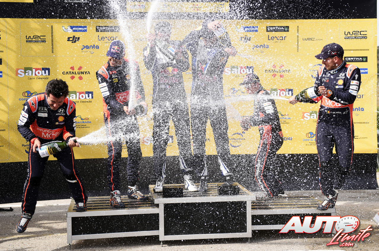 Podio de vencedores del Rally de España / Cataluña 2016, puntuable para el Campeonato del Mundo de Rallies WRC 2016. De izquierda a derecha: Marc Martí y Dani Sordo (Hyundai), Julien Ingrassia y Sébastien Ogier (Volkswagen) y Thierry Neuville junto a Nicolas Gilsoul (Hyundai).