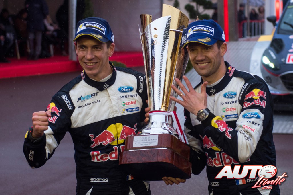 Sébastien Ogier y Julien Ingrassia recogiendo el trofeo de vencedores en el Rally de Montecarlo 2017, primera prueba puntuable para el Campeonato del Mundo de Rallies WRC 2017.