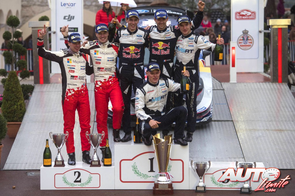 Podio del Rally de Montecarlo 2017, puntuable para el Campeonato del Mundo de Rallies 2017. De izquierda a derecha: Miikka Anttila con Jari-Matti Latvala (Toyota), Julien Ingrassia con Sébastien Ogier (Ford) y Ott Tänak con Martin Jarveoja (Ford).