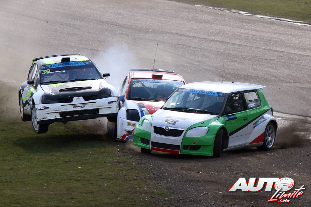 Espectacular lance de carrera protagonizado por tres participantes de la Categoría Súper 1600 en una prueba del Campeonato Británico de Rallycross 2013.