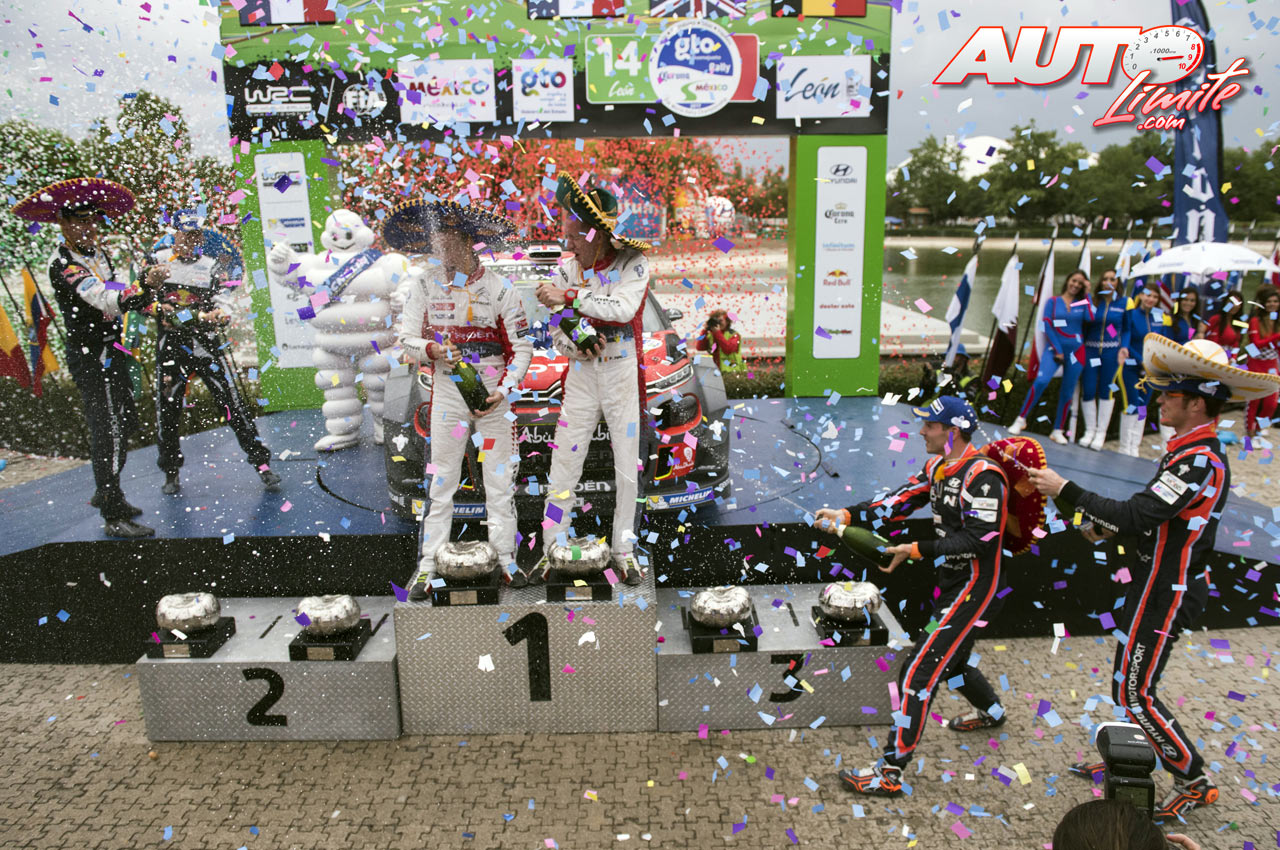 Podio del Rally de México 2017. De izquierda a derecha: Julien Ingrassia y Sébastien Ogier (Ford), Kris Meeke junto a Paul Nagle (Citroën) y Nicolas Gilsoul con Thierry Neuville (Hyundai).