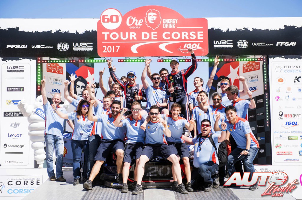 Equipo Hyundai Motorsport celebrando en el podio la victoria de Thierry Neuville en el Rally de Francia 2017, cuarta prueba puntuable del Campeonato del Mundo de Rallies WRC 2017.