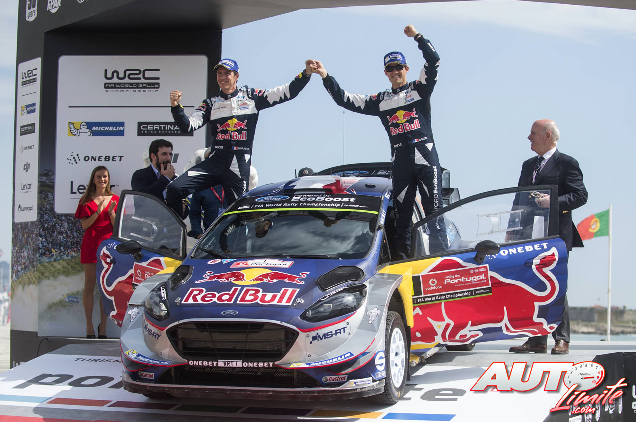Sébastien Ogier y Julien Ingrassia celebrando su victoria a bordo del Ford Fiesta WRC en el Rally de Portugal 2017, puntuable para el Campeonato del Mundo de Rallies WRC.