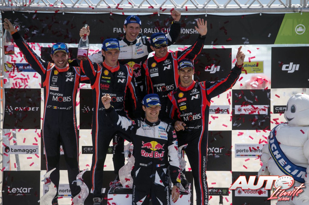 Podio del Rally de Portugal 2017, puntuable para el Campeonato del Mundo de Rallies WRC. Los vencedores, Sébastien Ogier y Julien Ingrassia (Ford), acompañados por Thierry Neuville y Nicolas Gilsoul (Hyundai), junto a Dani Sordo y Marc Martí (Hyundai).