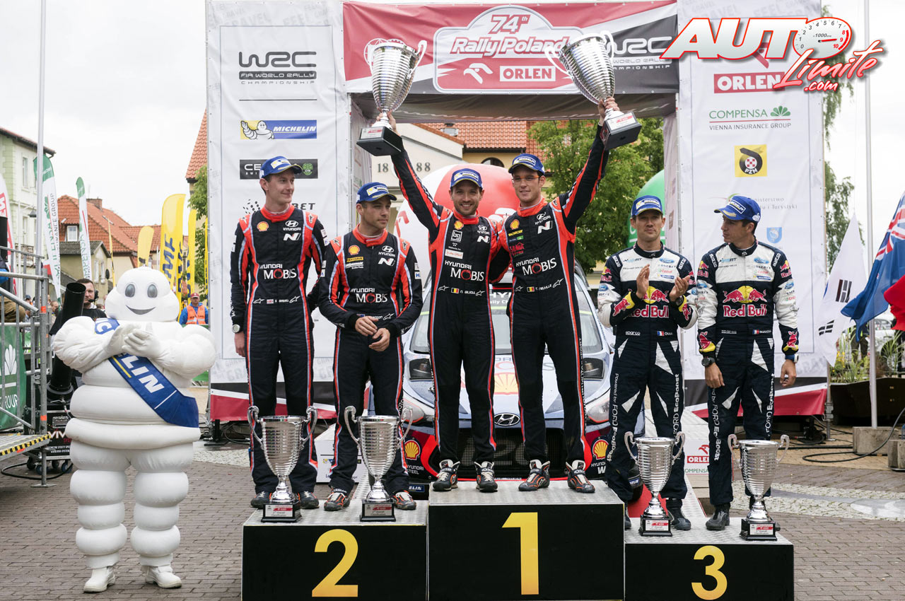 Podio del Rally de Polonia 2017. De izquierda a derecha: Sebastian Marshall y Hayden Paddon (Hyundai), Nicolas Gilsoul y Thierry Neuville (Hyundai), junto a Sébastien Ogier con Julien Ingrassia (Ford).