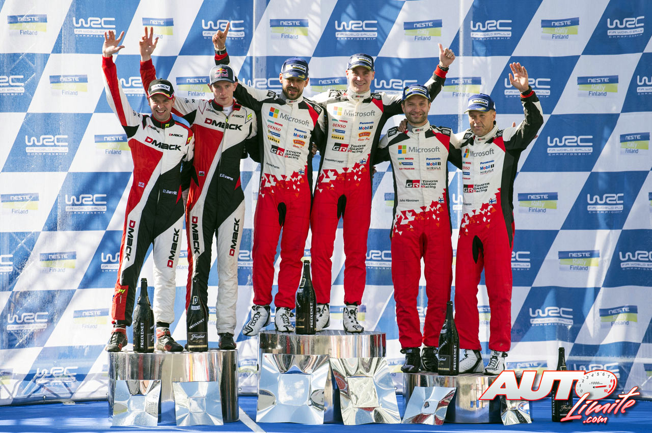 Podio del Rally de Finlandia 2017. De izquierda a derecha: Daniel Barritt y Elfyn Evans (Ford), Janne Ferm y Esapekka Lappi (Toyota), junto a Juho Hänninen y Kaj Lindström (Toyota).