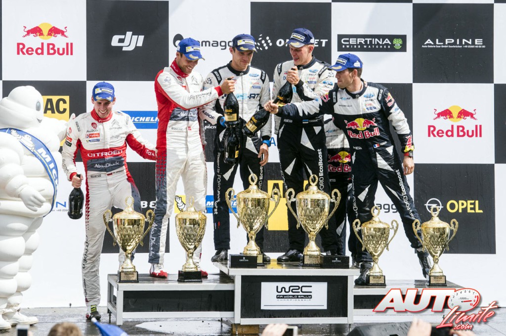 Ott Tänak (Ford), Andreas Mikkelsen (Citroën) y Sébastien Ogier en el podio del Rally de Alemania 2017, puntuable para el Campeonato del Mundo de Rallies WRC.