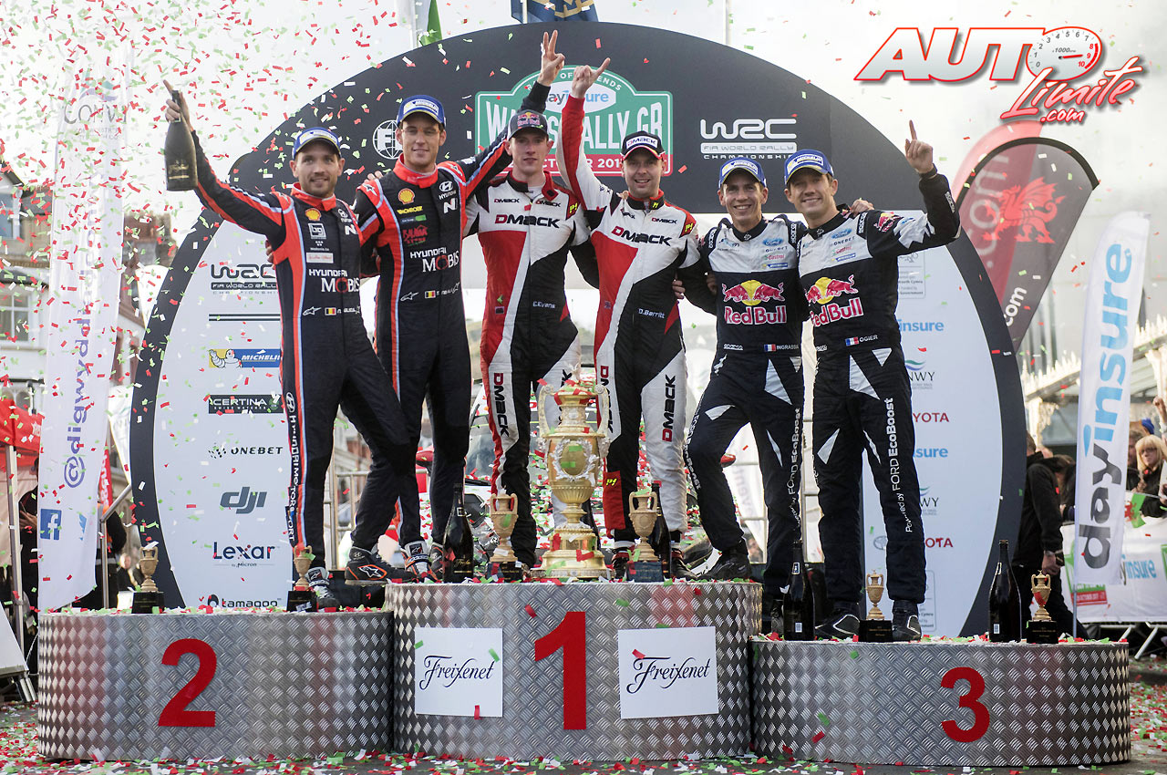 Podio del Rally de Gran Bretaña 2017. De izquierda a derecha: Nicolas Gilsoul y Thierry Neuville (Hyundai), Elfyn Evans con Daniel Barritt (Ford) y Julien Ingrassia junto a Sébastien Ogier (Ford).