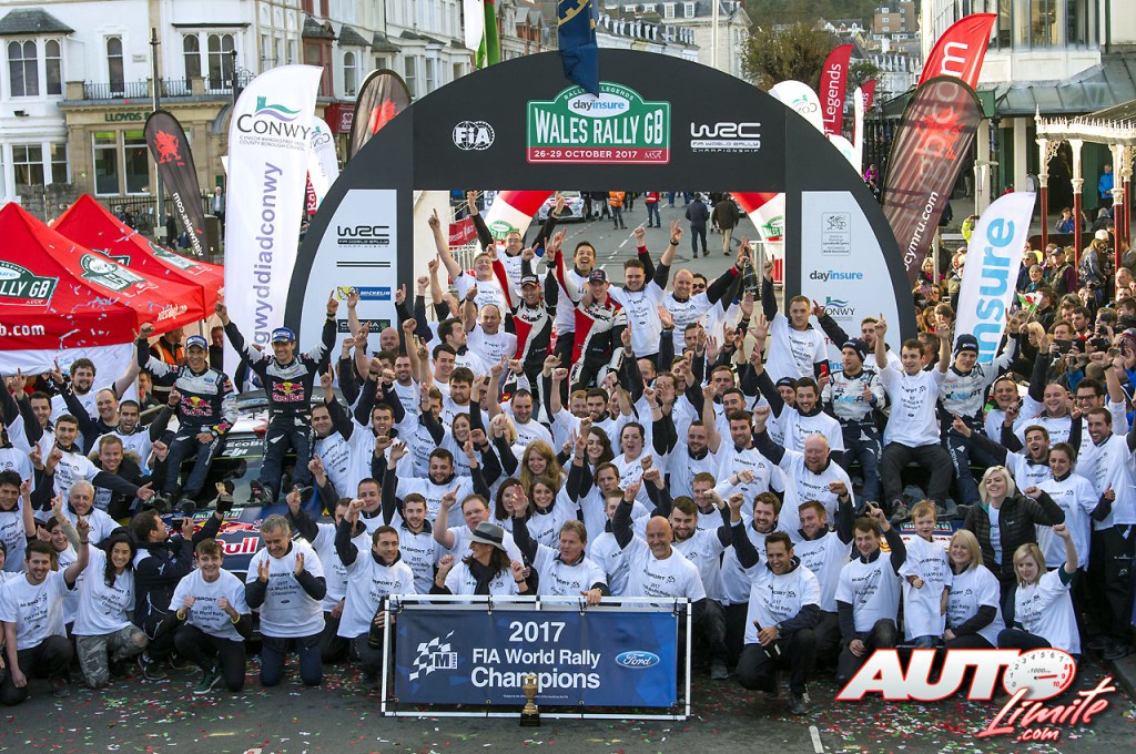 Todo el equipo M-Sport subido el podio del Rally de Gran Bretaña 2017, después de haber conseguido en título de pilotos (Sébastien Ogier) y marcas (Ford).