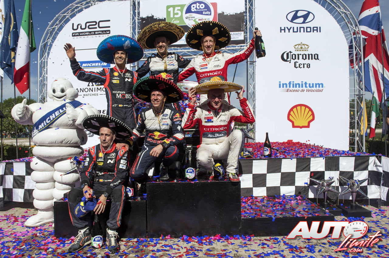 Podio del Rally de México 2018, puntuable para el Campeonato del Mundo de Rallies WRC. De izquierda a derecha y de arriba hacia abajo: Dani Sordo (Hyundai), Sébastien Ogier (Ford), Kris Meeke (Citroën), junto a sus respectivos copilotos, Carlos del Barrio, Julien Ingrassia y Paul Nagle.
