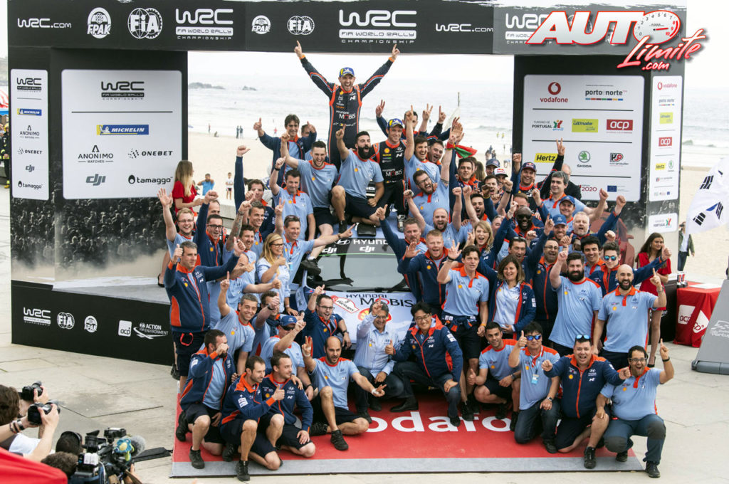 Thierry Neuville y el equipo Hyundai Motorsport, celebrando la victoria en el Rally de Portugal 2018, puntuable para el Campeonato del Mundo de Rallies WRC.