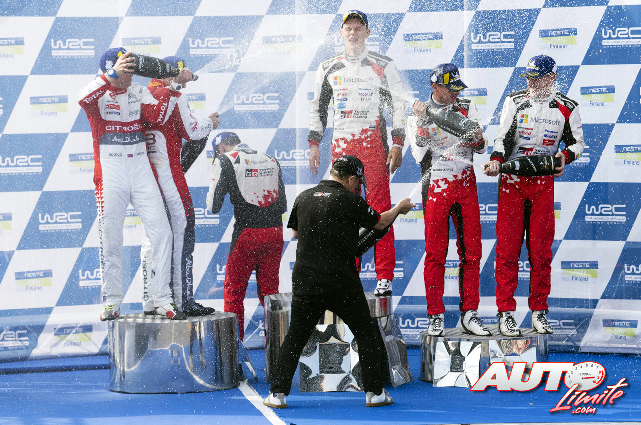 Podio del Rally de Finlandia 2018, puntuable para el Campeonato del Mundo de Rallies 2018. De izquierda a derecha: Torstein Eriksen y Mads Ostberg (Citroën), Martin Järveoja con Ott Tänak (Toyota) y Miikka Anttila junto a Jari-Matti Latvala (Toyota).