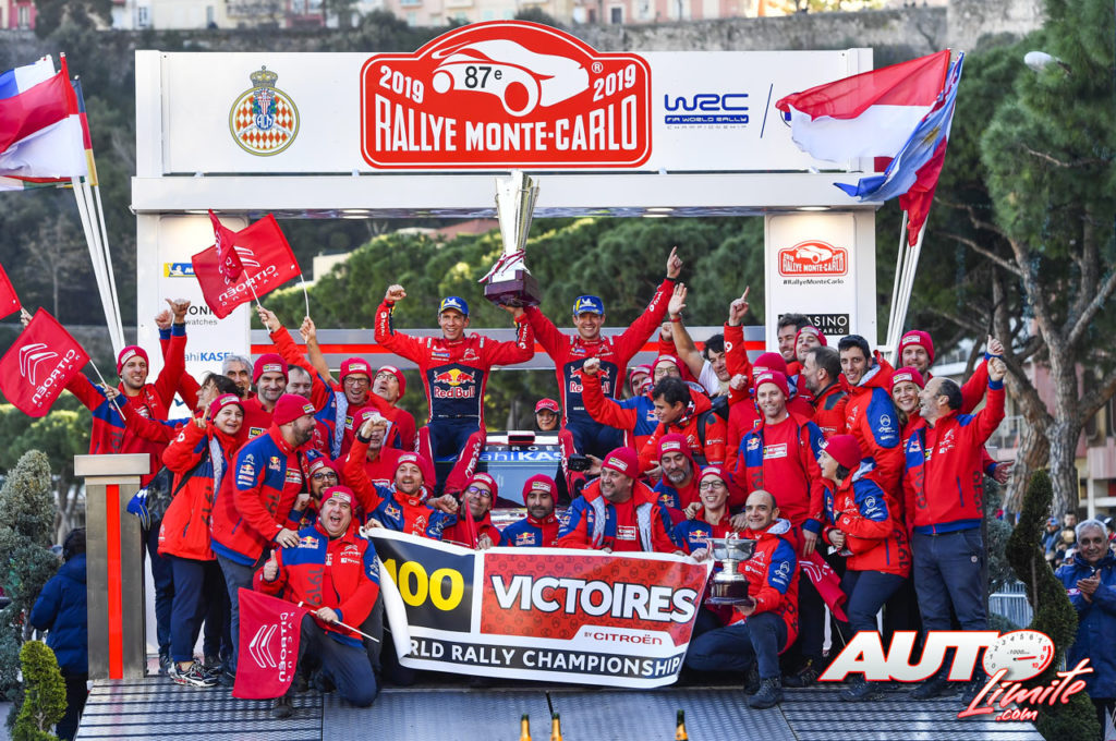 Sébastien Ogier y Julien Ingrassia en el podio del Rally de Montecarlo 2019, celebrando la victoria número 100 del equipo Citroën Racing en WRC.