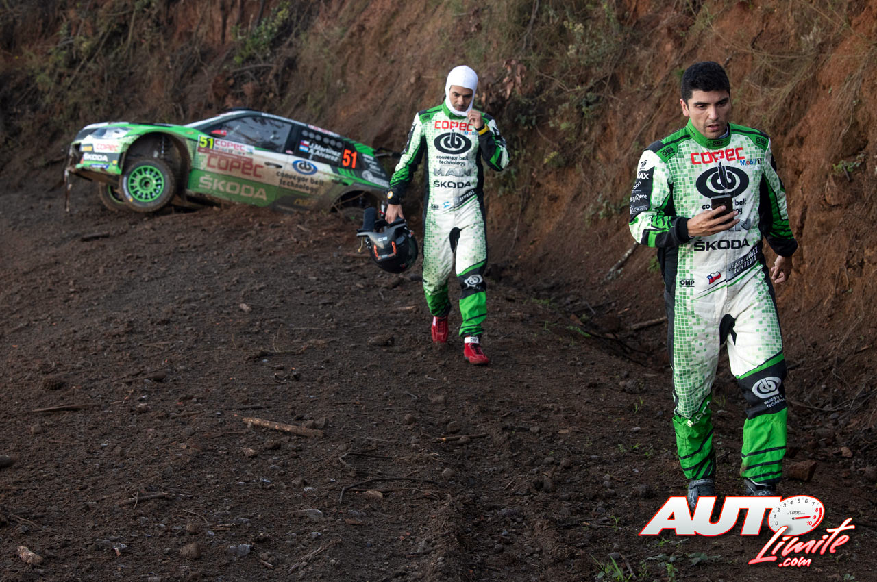 Jorge Martínez y Alberto Álvarez tras sufrir una salida en su Skoda Fabia R5 WRC2 durante el Rally de Chile 2019, puntuable para el Campeonato del Mundo de Rallies WRC2.