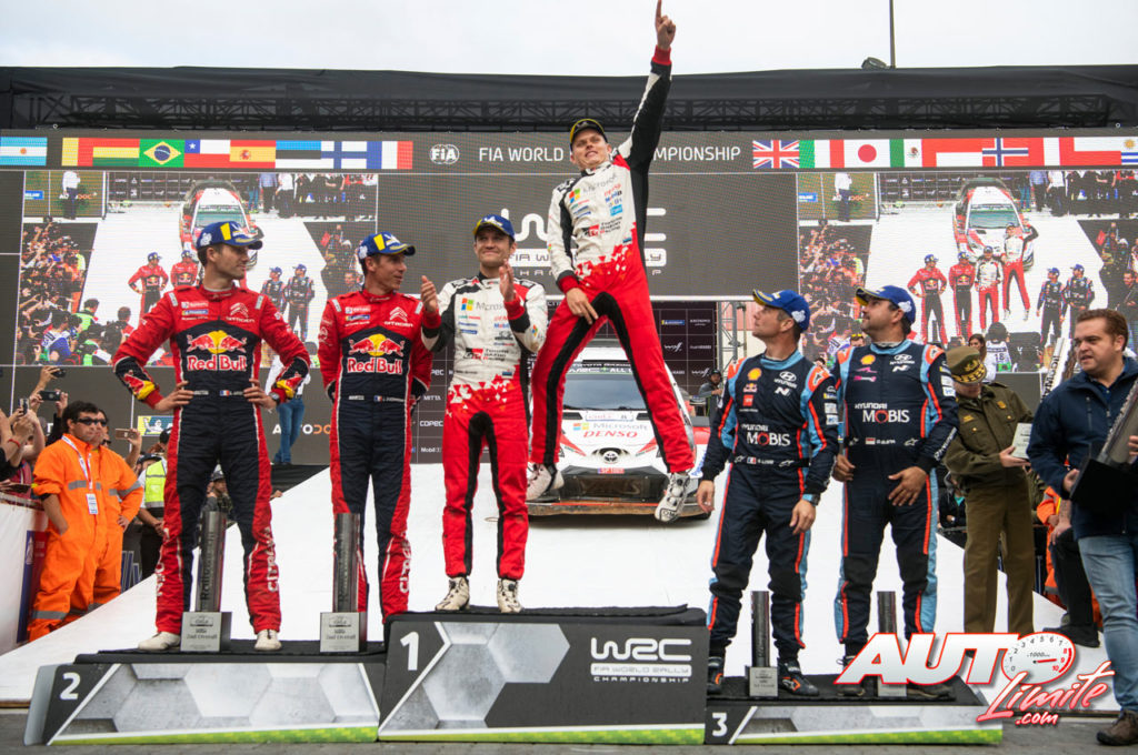 Podio del Rally de Chile 2019, puntuable para el Campeonato del Mundo de Rallies 2019. De izquierda a derecha: Sébastien Ogier y Julien Ingrassia (Citroën), Martin Järveoja con Ott Tänak (Toyota) y Sébastien Loeb junto a Daniel Elena (Hyundai).