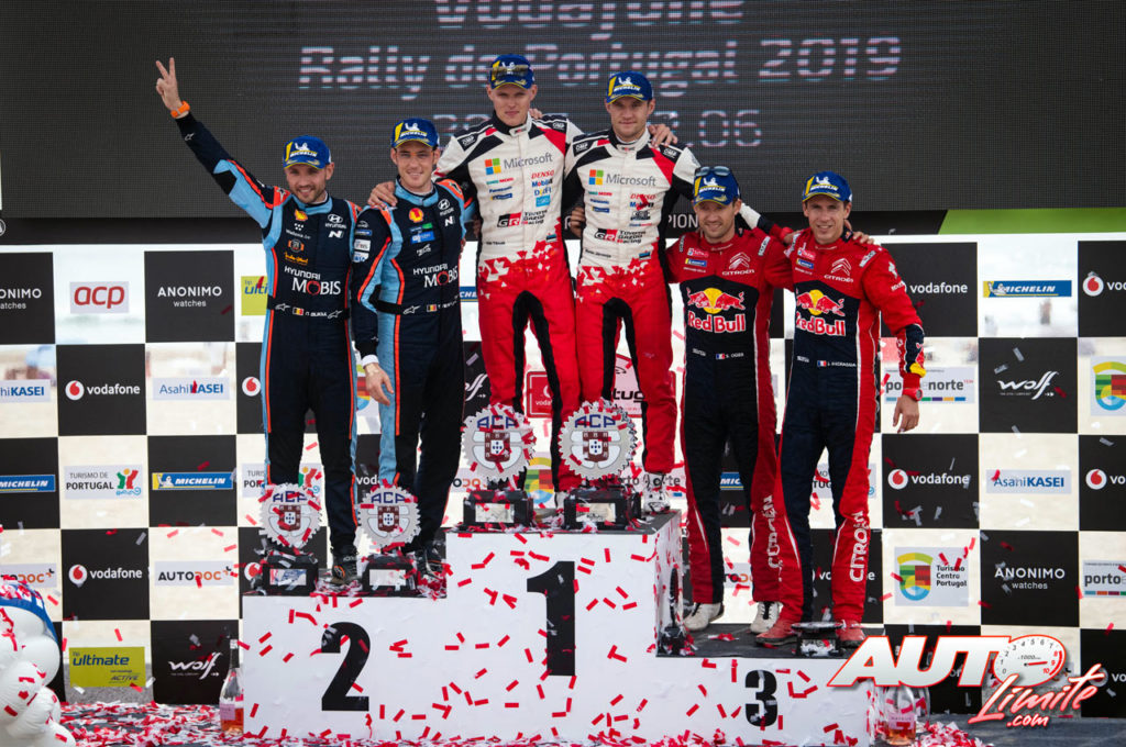 Podio del Rally de Portugal 2019, puntuable para el Campeonato del Mundo de Rallies 2019. De izquierda a derecha: Nicolas Gilsoul y Thierry Neuville (Hyundai), Ott Tänak con Martin Järveoja (Toyota) y Sébastien Ogier junto a Julien Ingrassia (Citroën).