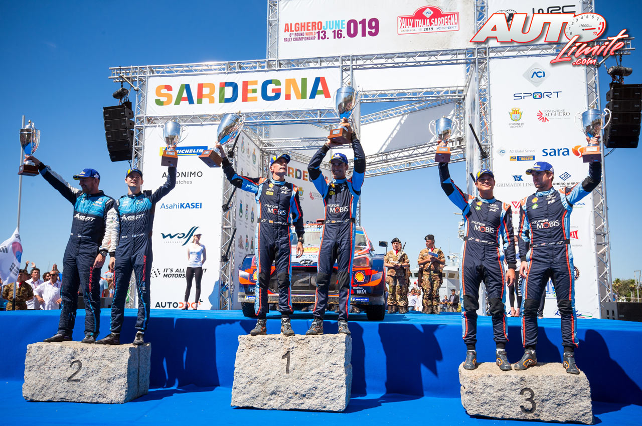 Podio del Rally de Italia - Cerdeña 2019, puntuable para el Campeonato del Mundo de Rallies 2019. De izquierda a derecha: Jarmo Lehtinen y Teemu Suninen (Ford), Carlos del Barrio con Dani Sordo (Hyundai) y Andreas Mikkelsen junto a Anders Jæger (Hyundai).