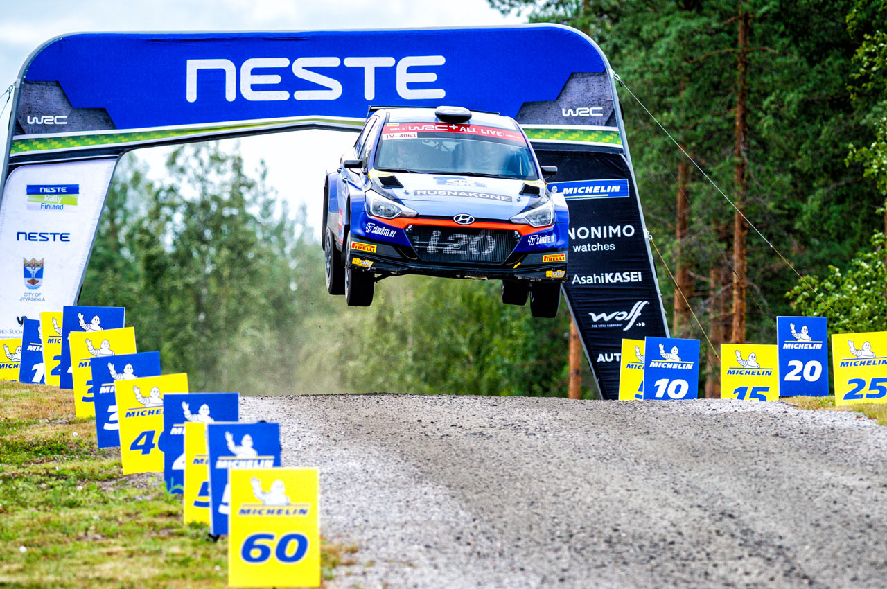 Jari Huttunen, al volante del Hyundai i20 R5 WRC2, durante el Rally de Finlandia 2019, puntuable para el Campeonato del Mundo de Rallies WRC2.