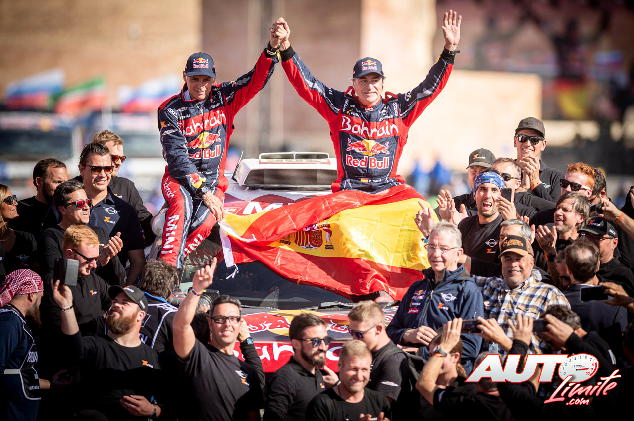 Carlos Sainz y Lucas Cruz, celebrando la victoria en el Rally Dakar 2020 con el MINI John Cooper Works Buggy.