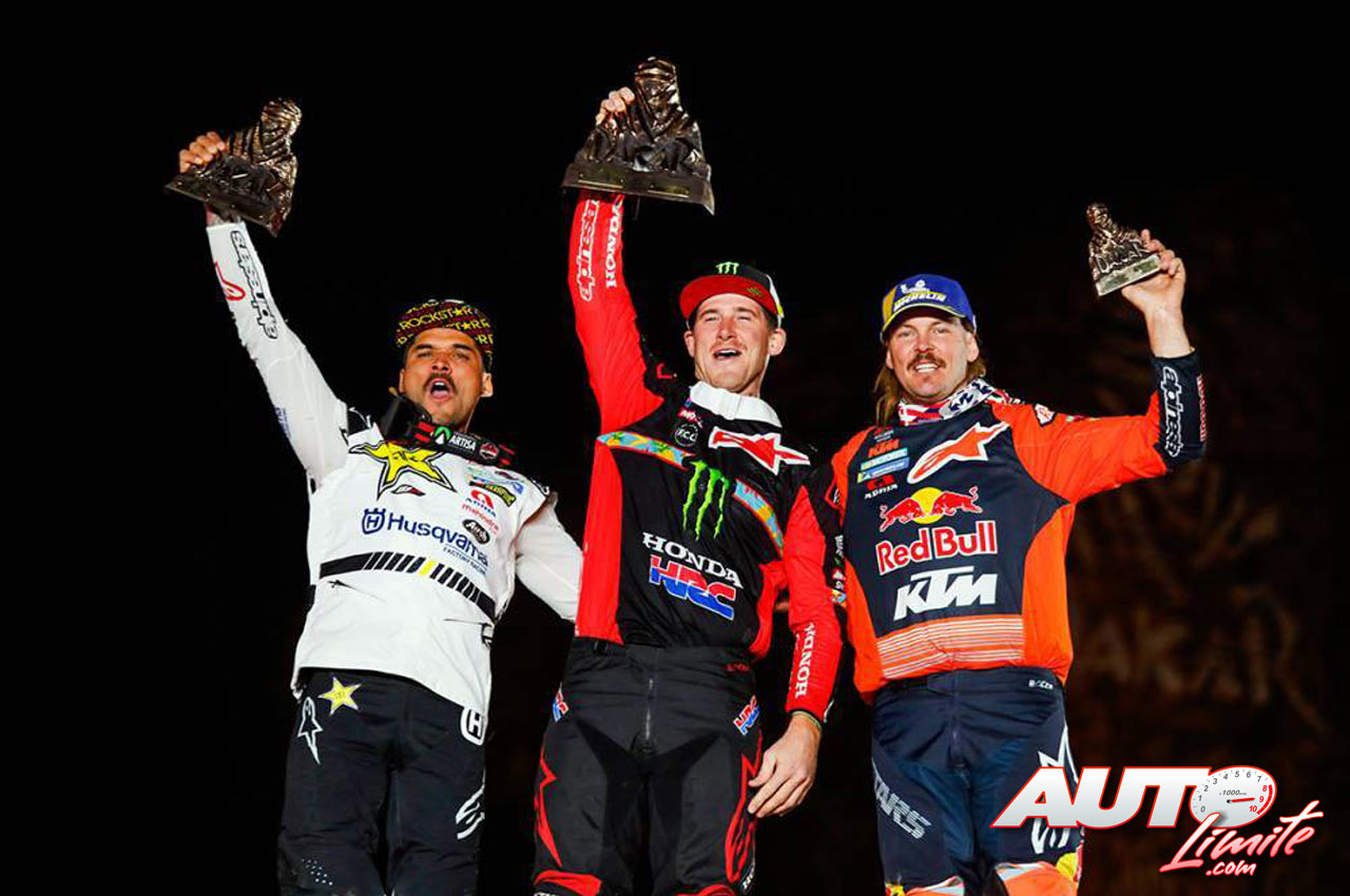 Podio de ganadores del Rally Dakar 2020 en la categoría de motos. De izquieda a derecha: Pablo Quintanilla (Husqvarna), el ganador Ricky Brabec (Honda) y Toby Price (KTM).
