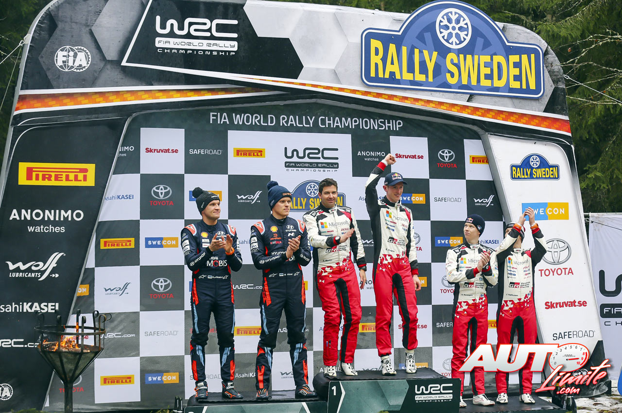 Podio del Rally de Suecia 2020, puntuable para el Campeonato del Mundo de Rallies WRC 2020. De izquierda a derecha: Martin Järveoja y Ott Tänak (Hyundai), Scott Martin con Elfyn Evans (Toyota) y Kalle Rovanperä junto a Jonne Halttunen (Toyota).