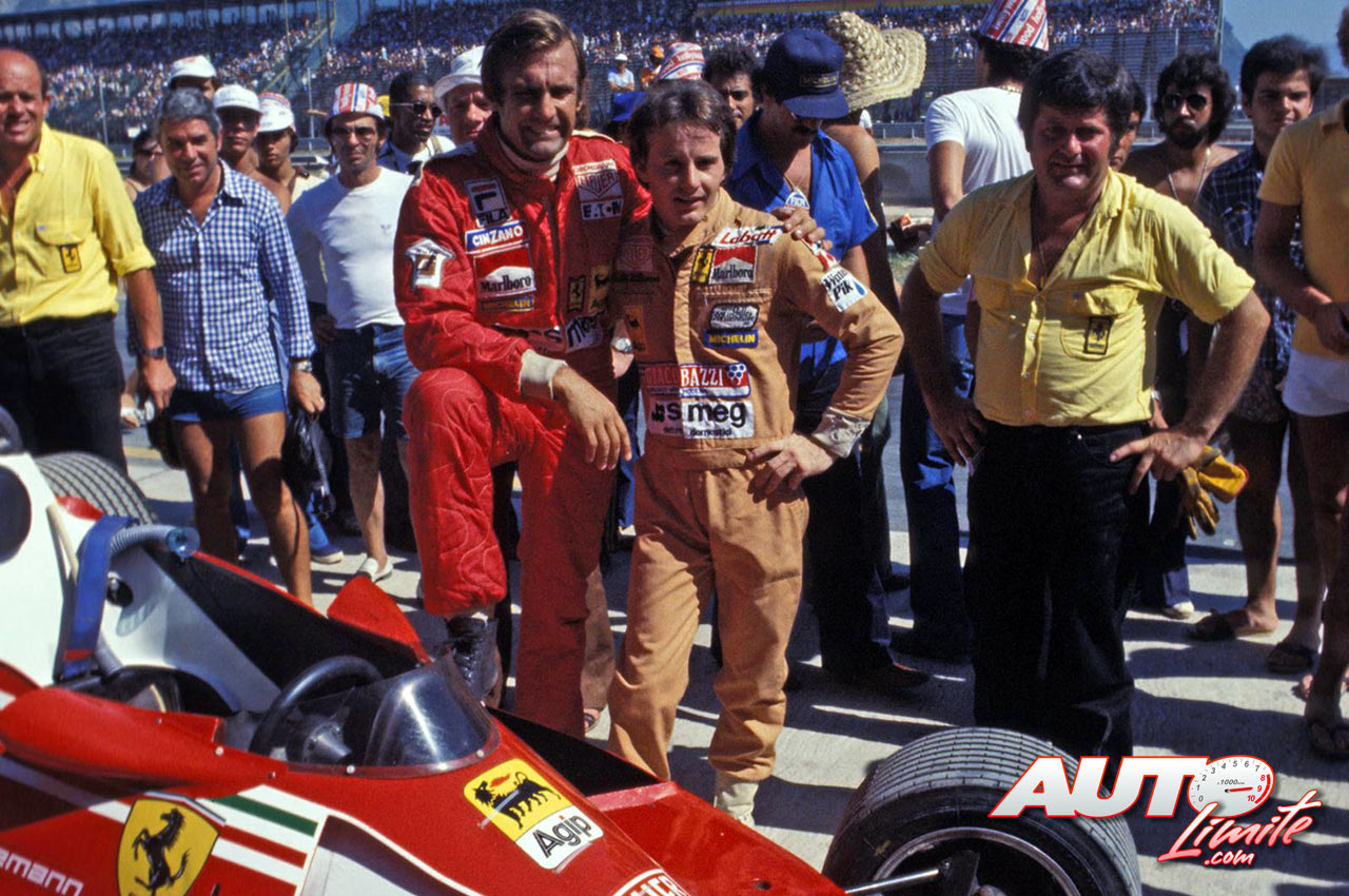 Gilles Villeneuve y su compañero Carlos Reutemann junto a uno de los Ferrari 312 T2B con los que disputaron el GP de Brasil de 1978, celebrado en el circuito de Jacarepaguá.