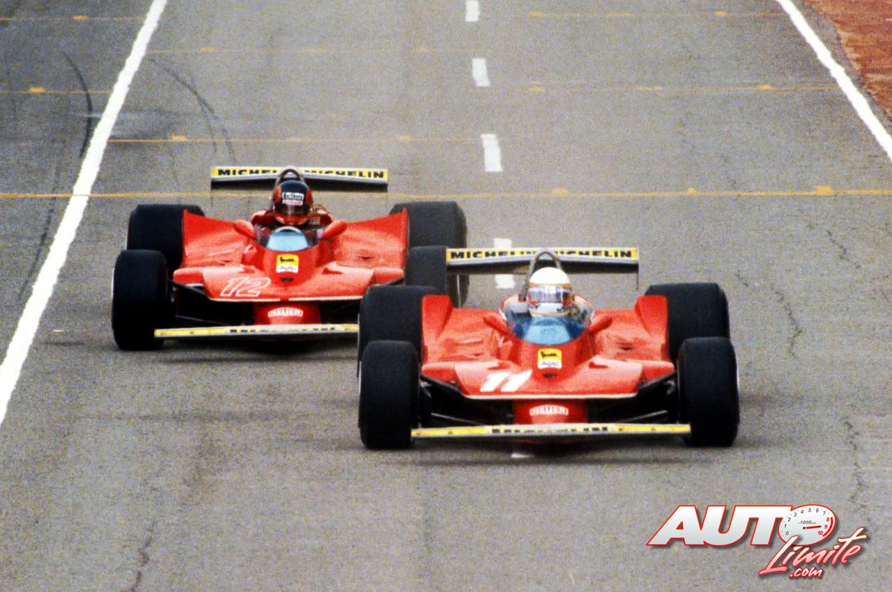 Jody Scheckter (nº 11) y Gilles Villeneuve (nº 12), al volante de sus Ferrari 312 T4, durante el GP de Sudáfrica de 1979, disputado en el circuito de Kyalami.
