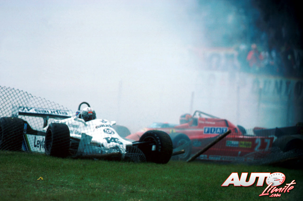 Gilles Villeneuve, al volante del Ferrari 126 CK, realizaba un trompo y provocaba una colisión múltiple durante el GP de Gran Bretaña de 1981, disputado en el circuito de Silverstone, en donde los otros pilotos afectados eran Alan Jones (Williams), Andrea de Cesaris (McLaren) y John Watson (McLaren).