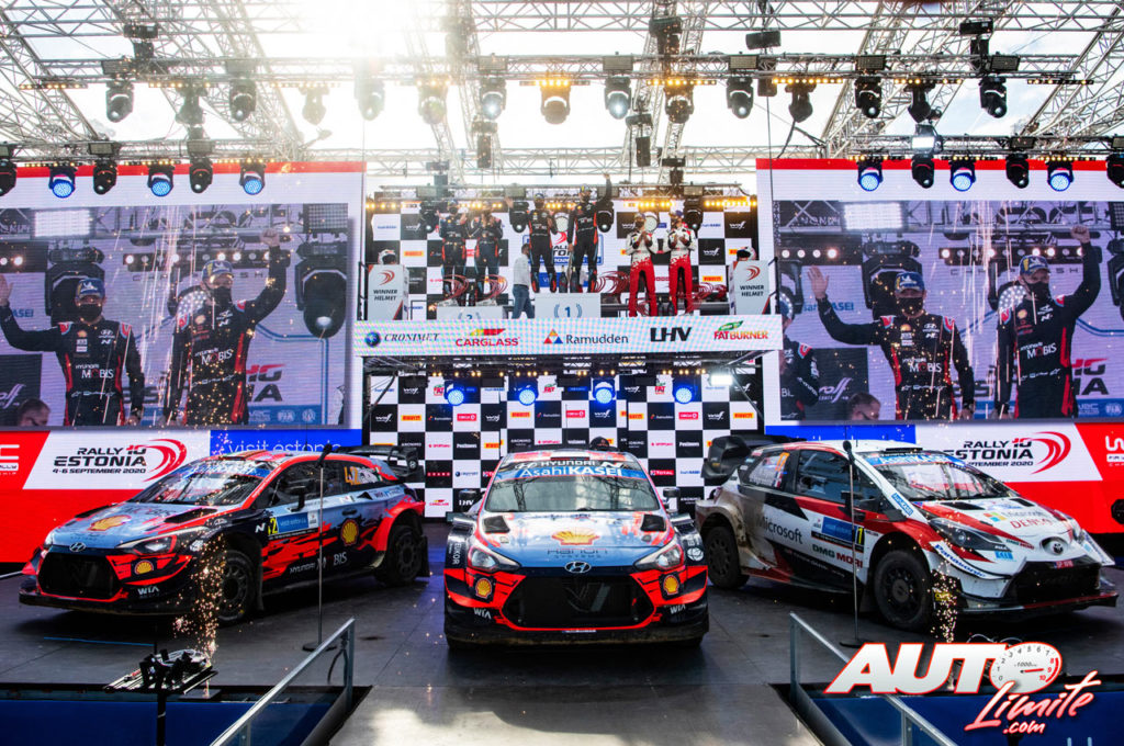 Ott Tänak (Hyundai), Craig Breen (Hyundai) y Sébastien Ogier (Toyota) subidos en el podio absoluto del Rally de Estonia 2020, en la categoría WRC.
